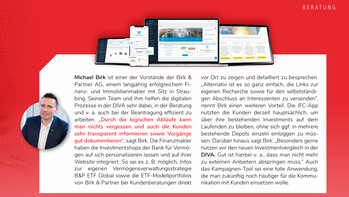 Die digitalen Prozesse in der BCA-Software „DIVA“ und die individualisierbaren Investmentshops der angeschlossenen Bank für Vermögen, helfen uns sehr bei der passgenauen und effizienten Beratung unserer Kunden.